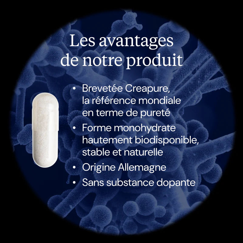 ✅ Label Creapure® : Dynveo utilise exclusivement cette forme allemande, considérée comme la référence mondiale pour sa pureté supérieure à 99,95 %.