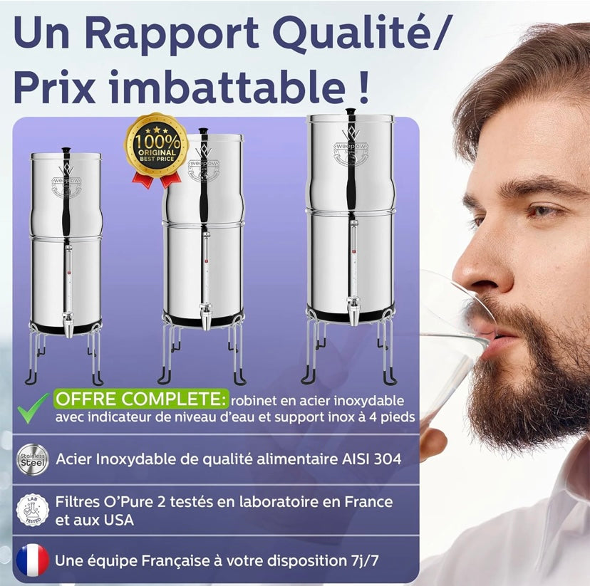 Ce système de filtration d’eau par gravité est conçu à partir d’un acier inoxydable AISI 304 de qualité alimentaire. Il est très efficace pour rendre potable toute source d’eau peu fiable.
